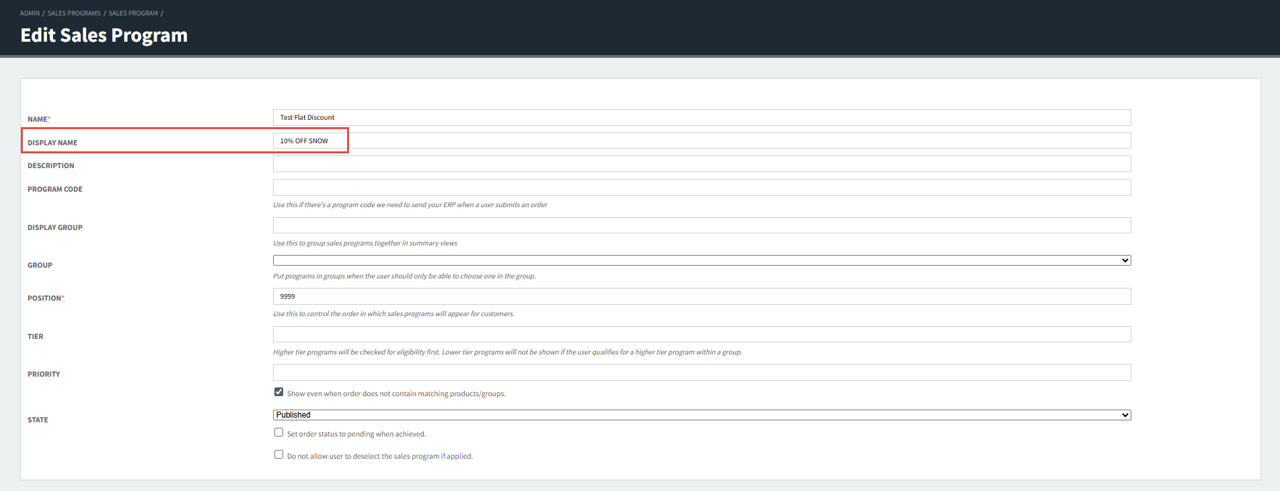 1. A display friendly name can now be assigned to a sales program. The Sales Program Name will still be the unique identifier for programs and no changes are needed to existing programs if using display name. This display name will replace the Sales Program Name on the frontend and in most exports. If you wish to use the Sales Program Display Name, you can contact us.